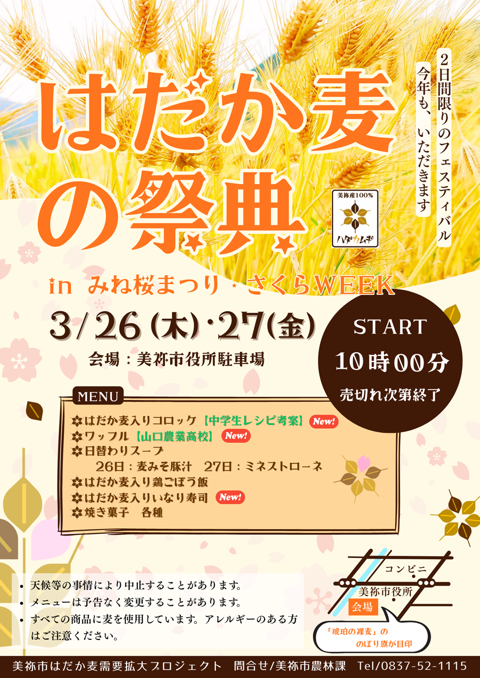 美祢市は、主に味噌や麦茶の原料となる「はだか麦」の県内最大の産地です。令和2年度から、美祢市はだか麦需要拡大プロジェトとして、関係機関と連携し、商品開発やPR活動を行っています。4回目となる今回は、公設塾mineto塾生の中学生や、山口農業高校の生徒が考案した新商品等も登場します。