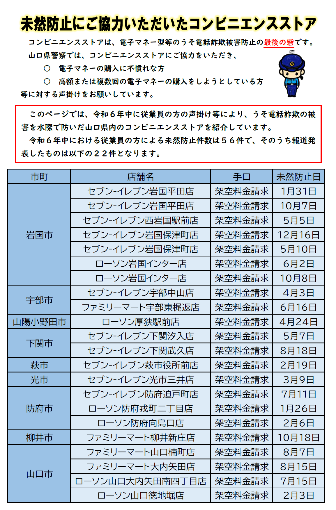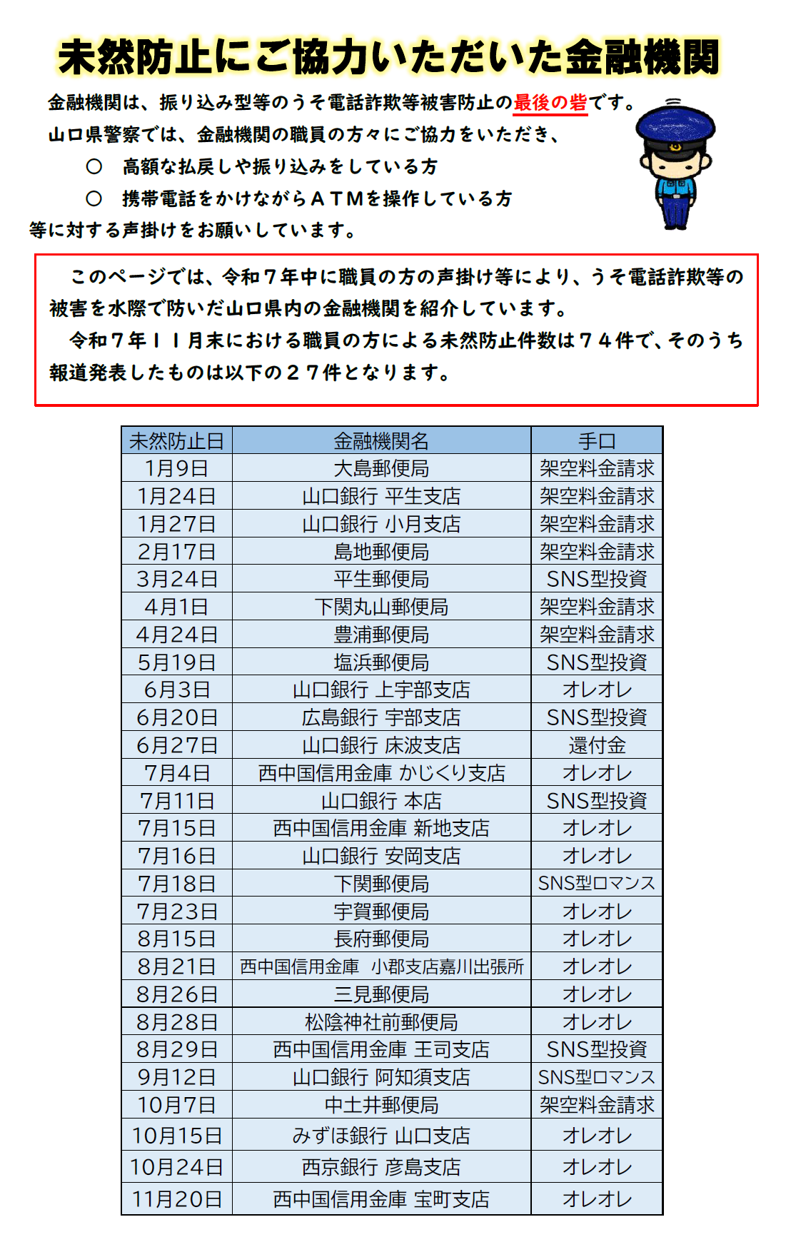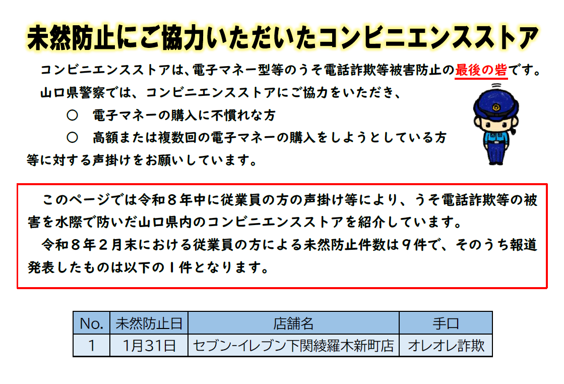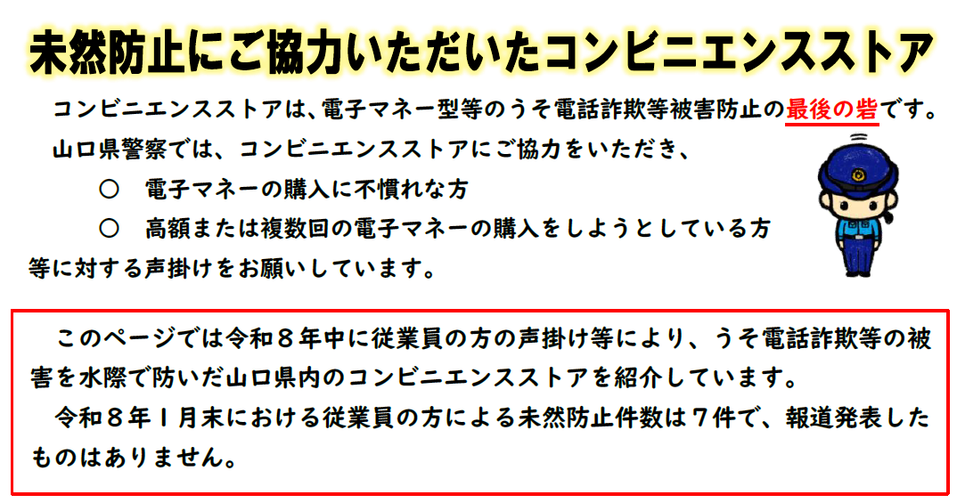 職員、従業員の方の声掛けなどにより、うそ電話詐欺の被害を水際で防いだ山口県内の金融機関、コンビニエンスストアを紹介しています。