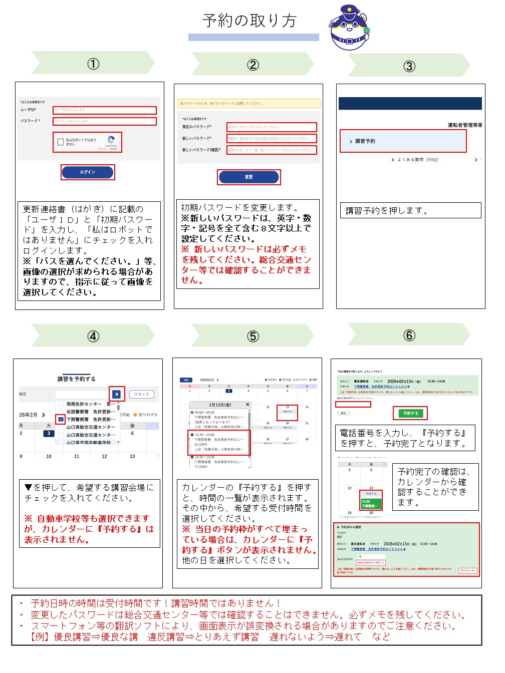 A7 更新はがき記載のIDとご自身で設定したパスワードで予約システムにログインし、講習会場を選択して予約を入れなおしてください。新しい希望日で予約を入れれば、以前の予約はキャンセルされます。予約の取り消しのみ行いたい場合は、画面の『予約を取り消す』をクリックすることで、キャンセルできます。