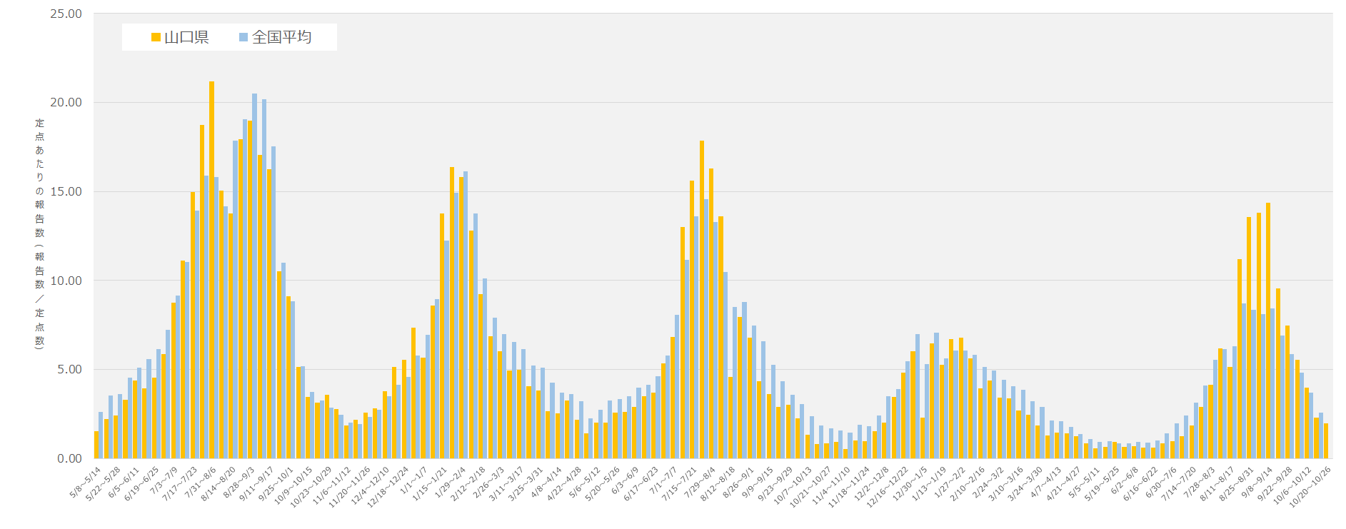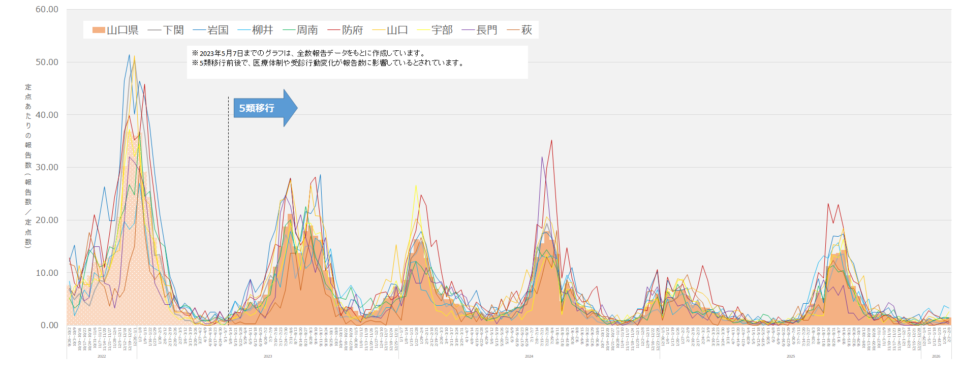第8波の全数把握データにおける定点医療機関(2023年5月時点:67医療機関)のデータを用いて定点あたりの報告数(参考値)を算出し、5類変更後の定点把握データと統合しグラフ化したものです。