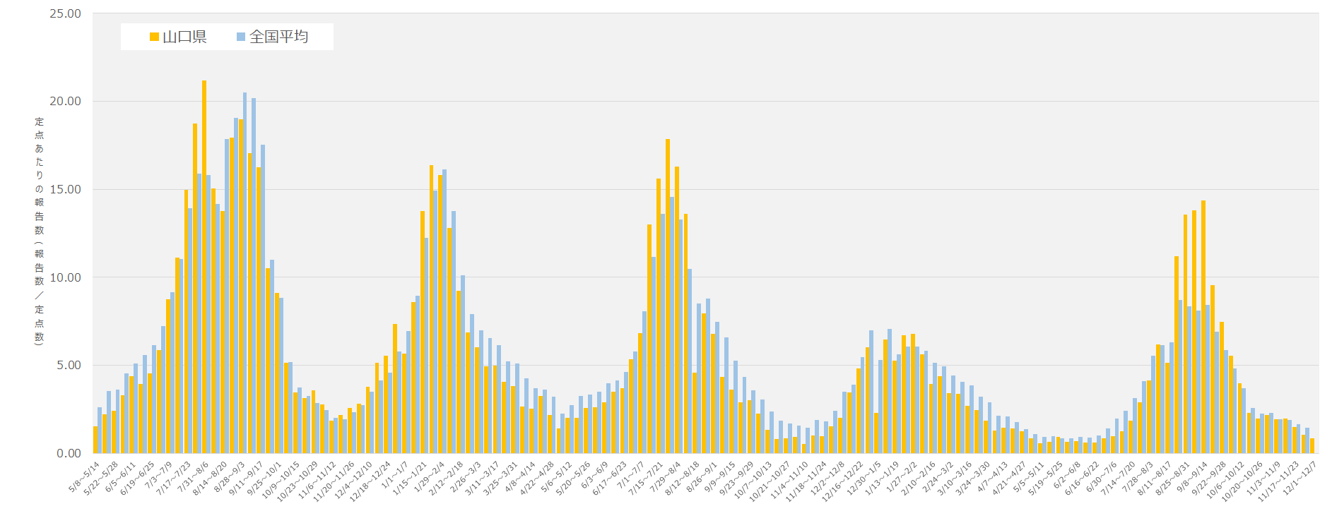 全国平均に関するデータは、国立感染症研究所IDWR(感染症発生動向調査 週報)<外部リンク>において速報値として公開されています。また、厚生労働省のCOVID-19に関する報道発表<外部リンク>資料<外部リンク>からも参照することができます。