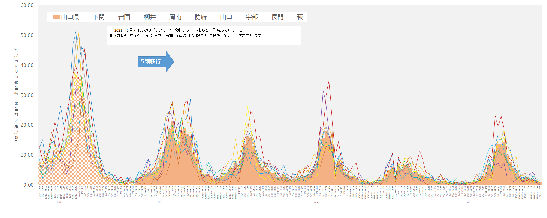 このグラフは、第8波から5類変更以降の発生状況を大まかに比較することができますが、5類変更に伴い発熱外来の体制や発熱者の受診行動などが変化しているため、5類変更後の定点把握データとの単純比較ができるものではないことに留意する必要があります。