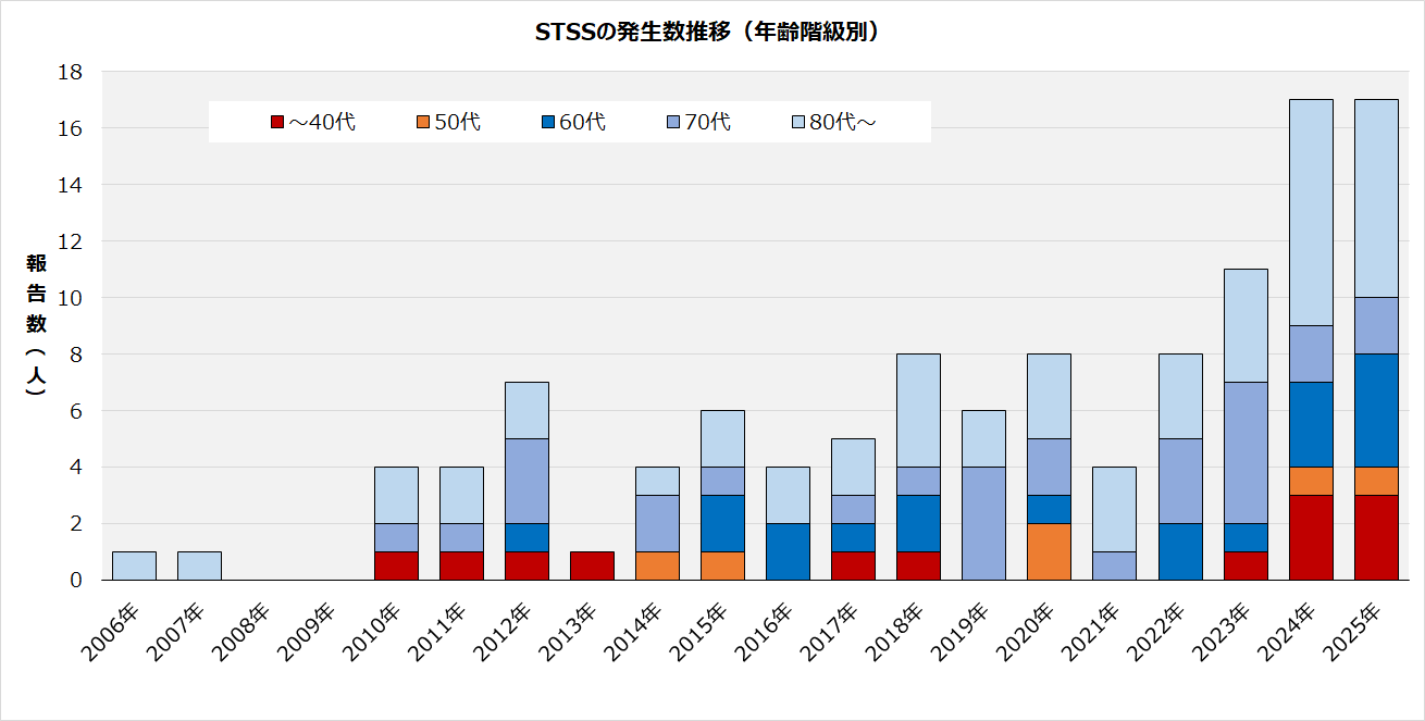 国内におけるSTSSの発生状況は、2023年941人、2024年1888人(速報値)と過去最多を更新しています。山口県においても、2023年12人、2024年17人、2025年18人と増加傾向にあります。